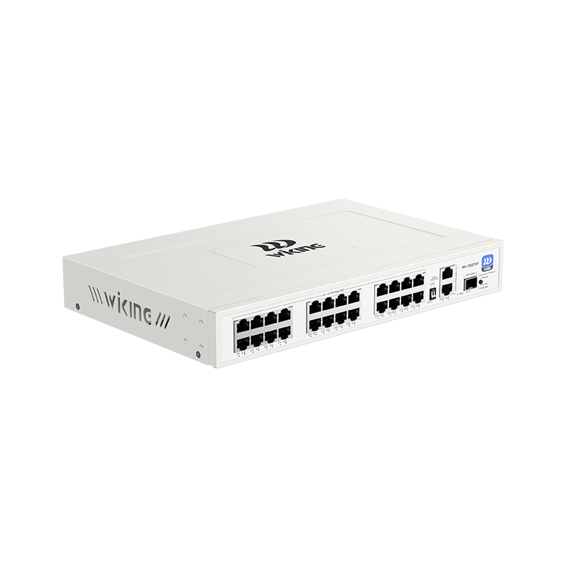 24 puertos PoE 10/100 Mbps, 2 puertos uplink RJ45 10/100/1000 Mbps y 1 ranura SFP de 1000 Mbps.